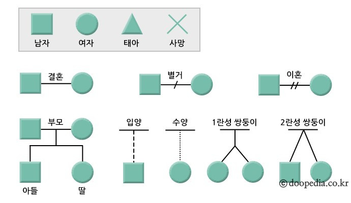 사망은 X, 태아는 세모로 표시하고 입양이나 수양은 점선, 쌍둥이는 하나의 선에서 같이 가지처럼 퍼지게 그려넣어요. 보웬 가족치료에서는 갈등 관계일 때는 지그재그 선으로, 밀착일 때는 대각선 세 개로 표현합니다. 아래 보웬 가족치료 페이지를 참고하세요. 아래 그림(두산백과)은 간단히 나온 거고요.