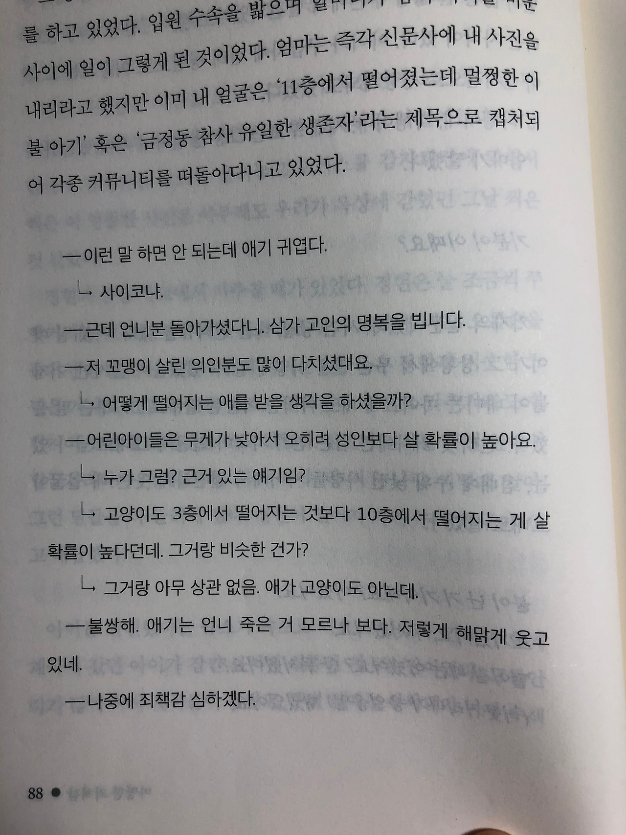 그 당시 나는 할머니의 손에 맡겨졌었고, 엄마와 아빠는 장례 준비를 하고 있었다. 입원 수속을 밟으며 할머니가 잠시 자리를 비운 사이에 일이 그렇게 된 것이다. 엄마는 즉각 신문사에 내 사진을 내리라고 했지만 이미 내 얼굴을 '11층에서 떨어졌는데 멀쩡한 이불 아기' 혹은 '금정동 참사 유일한 생존자'라는 제목으로 캡처되어 각종 커뮤니티를 떠돌아다니고 있었다.