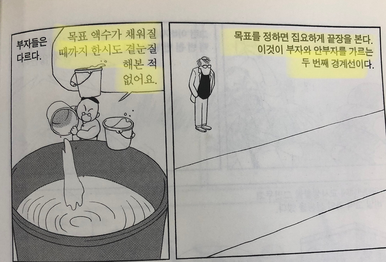 그들의 인터뷰를 따라가다 보면 '뭐야, 다 아는 얘기 잔 아'하는 생각도 듭니다. 하지만 이와 같이 행하는 사람이 거의 없다는 것이 문제죠. 알고 있지만 Just do it 하기는 어렵다는 얘기입니다. 사소해 보이지만 그것들을 단지 알고 있는 것과 어떻게든 행하는 것의 차이가 부자와 안부자 가르는 것이라는 생각이 듭니다. 일전에 장사가 잘 되는 가게 주인이 TV에 나와 자신만의 노하우를 아낌없이 소개를 했어요. 이렇게 모든 것을 알려줘도 되냐는 인터뷰어의 물음에 주인은 웃으며 대답합니다. "이렇게 알려줘도 알려준 대로 하는 사람이 없어요" 우리는 부자가 되는 법을 알고 있을 가능성이 높아요. 심플하게는 지출보다 수입을 늘려야겠죠. 유망한 투자처를 찾기 위해 공부해야 하고 좋은 부동산 매물을 찾기 위해 오랜 시간 발품을 팔아야 합니다. 이러한 것들을 우리가 모르지 않죠. 하지만 알아도 실천으로 옮기지 않는 것이 문제입니다. 실천의 과정에는 분명 어려움과 수고로움이 있겠지만 과실은 끝끝내 사소한 것들을 지켜낸 사람들의 것이지 않을까요.