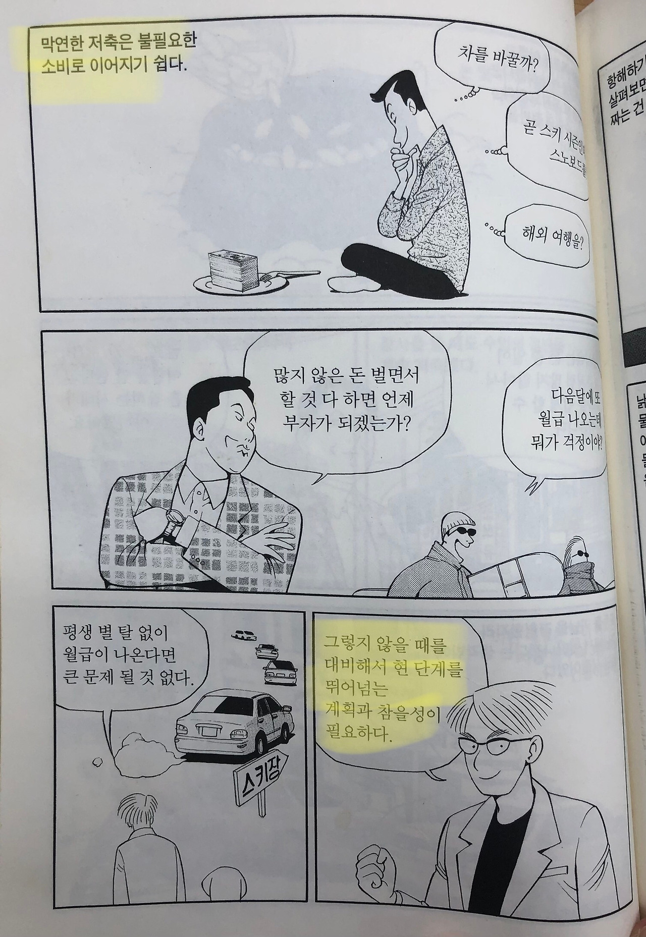 저의 경우 이 책을 읽으면서 무엇보다도 목표의 부재를 느꼈습니다. 막연히 부자가 되고 싶다고 갈망했지 구체적인 단기, 중장기 목표와 목표에 도달하기 위한 계획이 없었어요. '단순히 소비를 줄이고 저축하자'라고 마음먹었을 경우 결과가 좋지 않을 가능성이 높아요. 뚜렷한 목표가 없다 보니 중간에 길을 잃고 포기하게 됩니다. 시간이 지나 원래의 관성대로 소비를 하고 있는 것이죠. 100명의 부자들이 주식 투자를 할 때도 터무니없는 수익률을 바라기보다는 대다수의 부자들은 20%~30% 수익률을 목표로 한답니다. 욕심을 부리지 않는 거죠. 직장인의 경우 월급이 입금되면 쓰고 남은 돈으로 저축을 하지 않고, 약간 무리하게 저축을 먼저 하고 나머지 돈을 생활비로 씁니다. 쓸 거 다 쓰고 저축은 할 수 없다는 것이죠. 부자들은 저축을 할 때도 명확한 액수를 설정해요. 월급의 50%는 무조건 저축 나머지 20%는 주식 투자 그리고 나머지 30%로 생활비를 쓰는 식이죠. 그리고 종잣돈이 모이면 대출을 받아 부족한 금액을 채우고 부동산이나 다른 투자처에 투자한다고 합니다. 현재까지 부동산은 불패였어요. 하지만 금리가 오르고 집 값이 떨어지면 빚을 감당하기가 어려울 수도 있으니 주의해야 합니다. 부동산에 투자 할 때 혹여 집값이 떨어져도 감당할 수 있을 정도인지 미리 검토해 봐야겠지요.