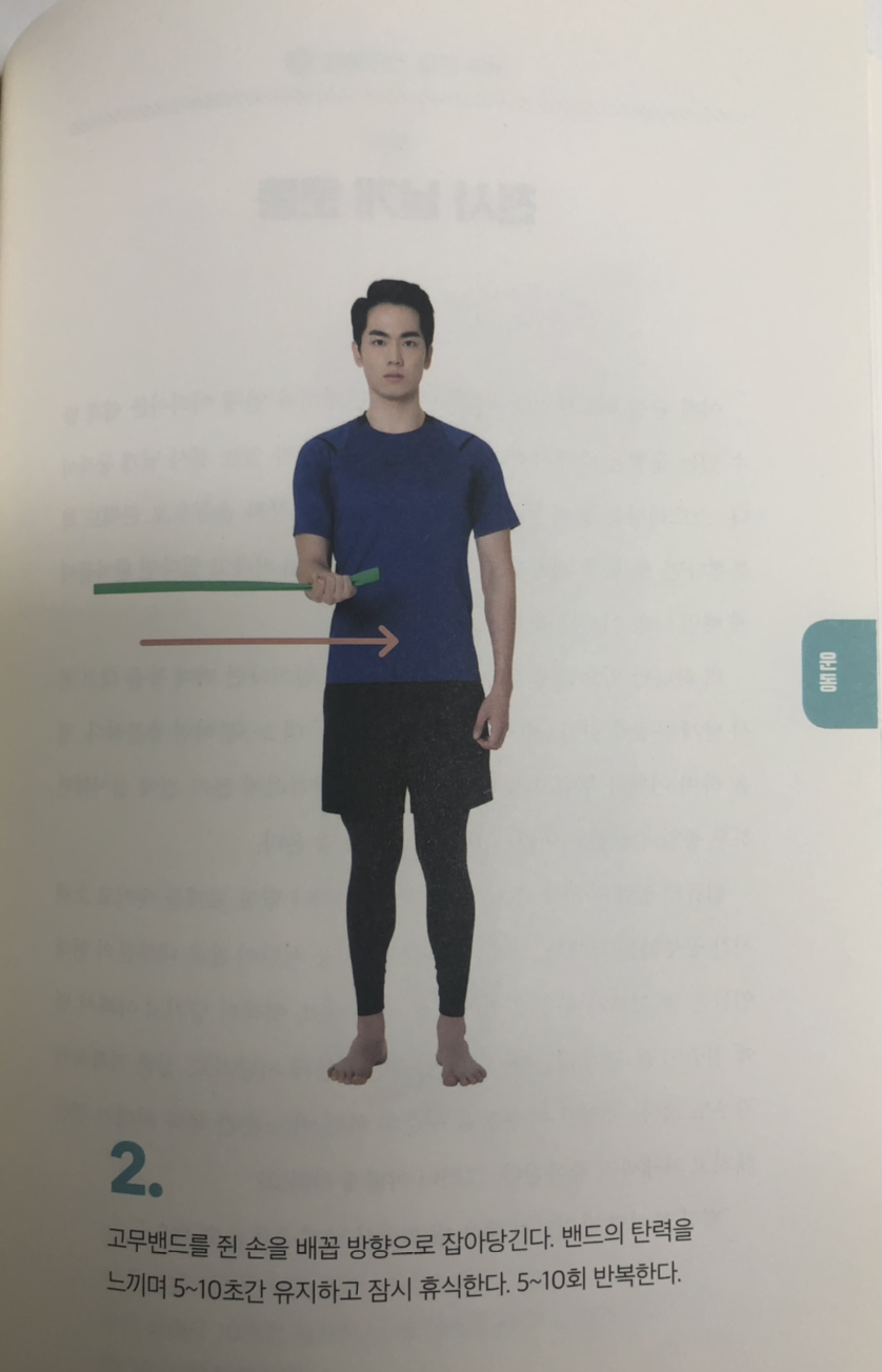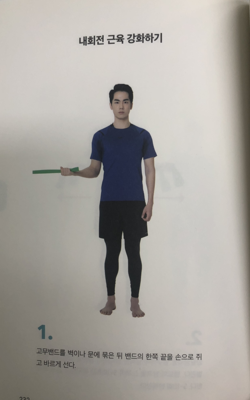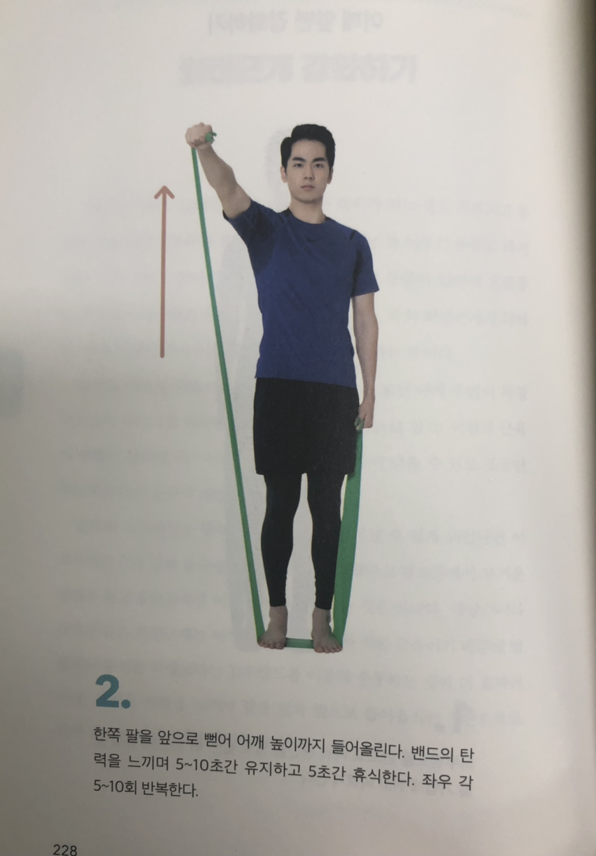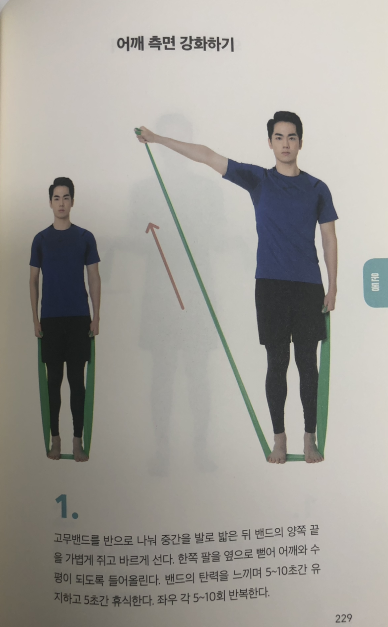 올바른 스트레칭을 통해 예전처럼 팔을 움직일 수 있게 되었다면 이제부터는 근육 강화 운동을 시작해야 한다. 그렇다고 헬스장에서 무거운 덤벨을 들고 울룩불룩한 어깨 근육을 만들라는 것은 아니다. 극상근이나 극하근 같은 회전근개는 어깨 깊은 곳에 위치한 작은 근육이기 때문에 덤벨이나 무거운 바벨보다는 고무밴드를 이용해 운동하는 것이 더 효과적이다. 가벼운 저항을 느끼며 팔을 앞과 옆으로 들어 올리는 것만으로도 어깨 깊숙한 회전근개를 단련할 수 있다.