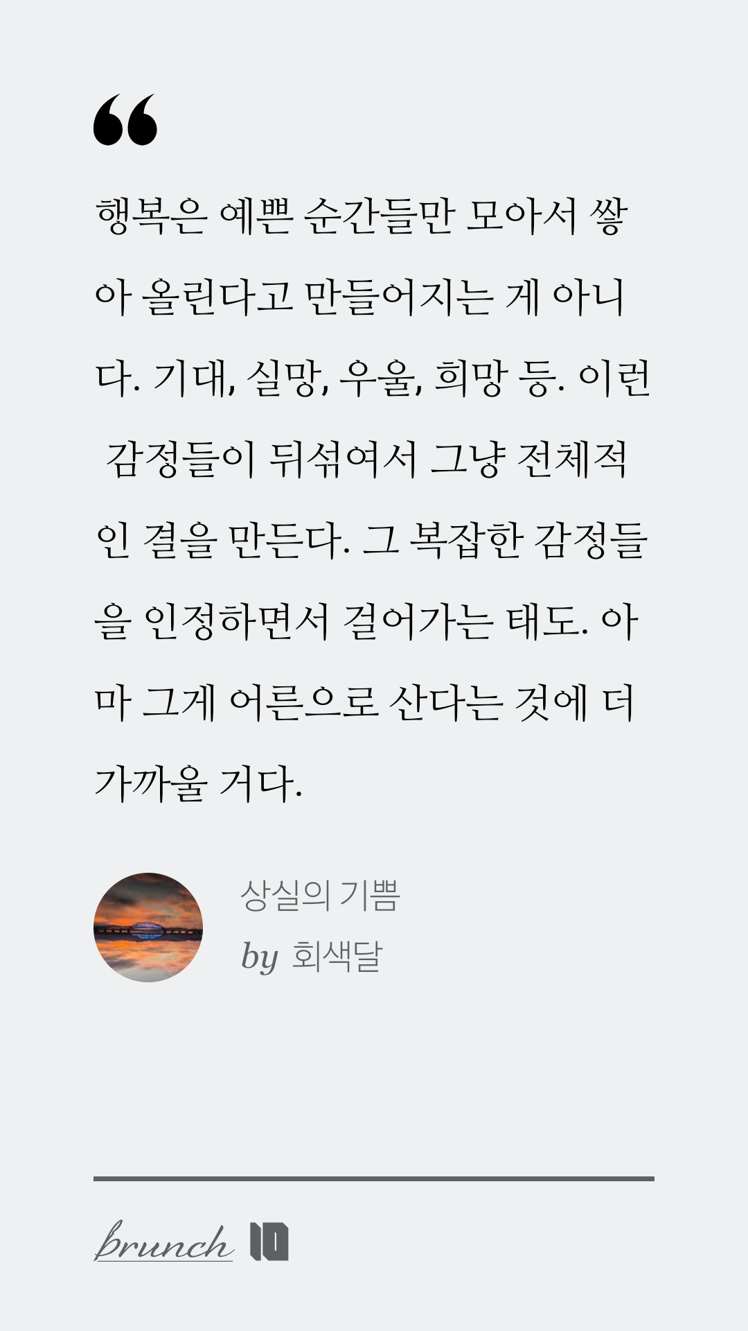 행복은 예쁜 순간들만 모아서 쌓아 올린다고 만들어지는 게 아니다. 기대, 실망, 우울, 희망 등. 이런 감정들이 뒤섞여서 그냥 전체적인 결을 만든다. 그 복잡한 감정들을 인정하면서 걸어가는 태도. 아마 그게 어른으로 산다는 것에 더 가까울 거다.