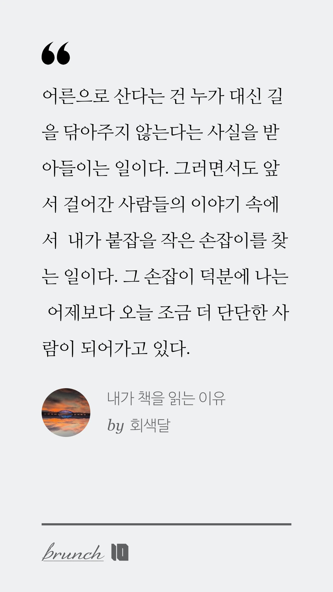 어른으로 산다는 건 누가 대신 길을 닦아주지 않는다는 사실을 받아들이는 일이다. 그러면서도 앞서 걸어간 사람들의 이야기 속에서 내가 붙잡을 작은 손잡이를 찾는 일이다. 그 손잡이 덕분에 나는 어제보다 오늘 조금 더 단단한 사람이 되어가고 있다.