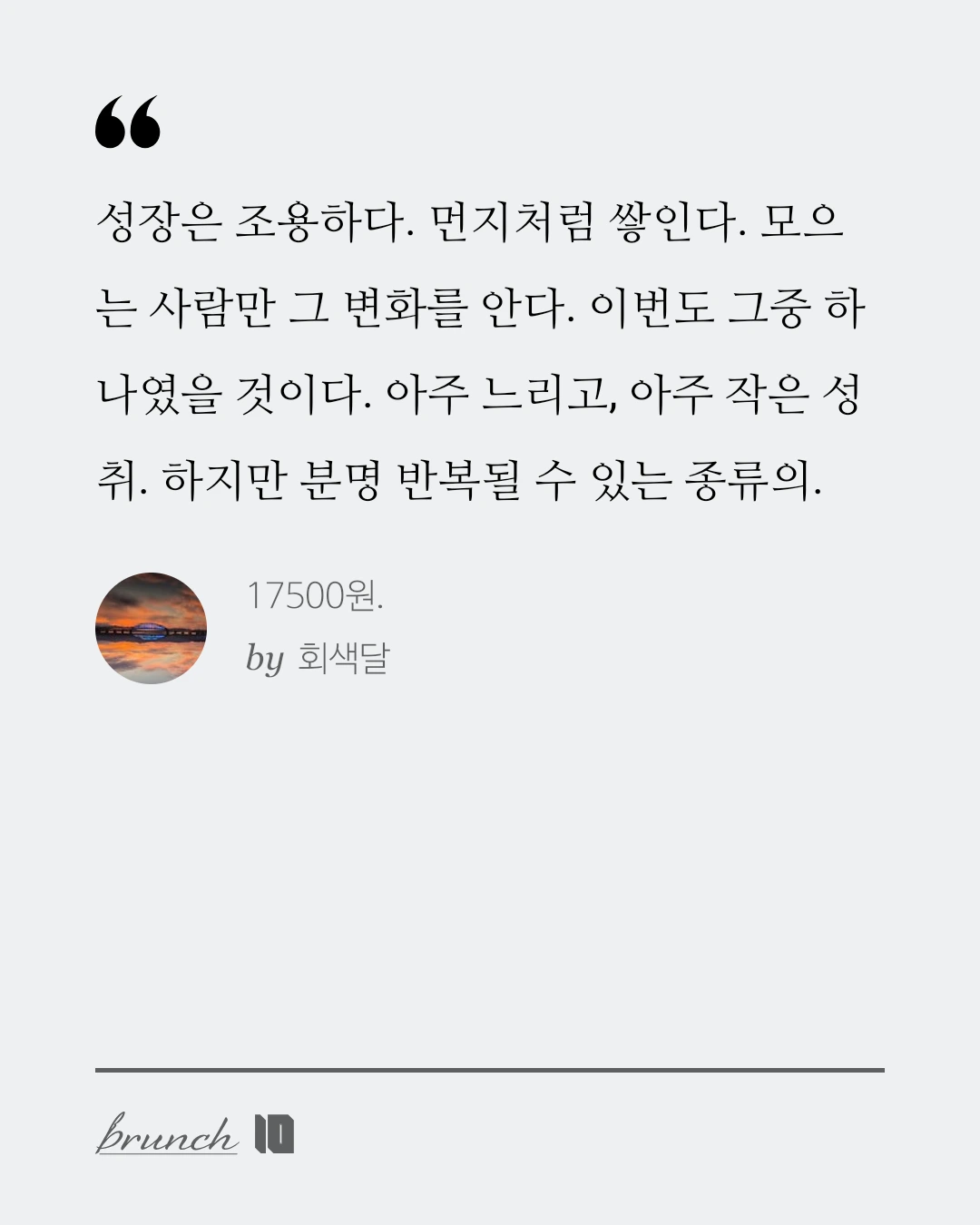 성장은 조용하다. 먼지처럼 쌓인다. 모으는 사람만 그 변화를 안다. 이번도 그중 하나였을 것이다. 아주 느리고, 아주 작은 성취. 하지만 분명 반복될 수 있는 종류의.