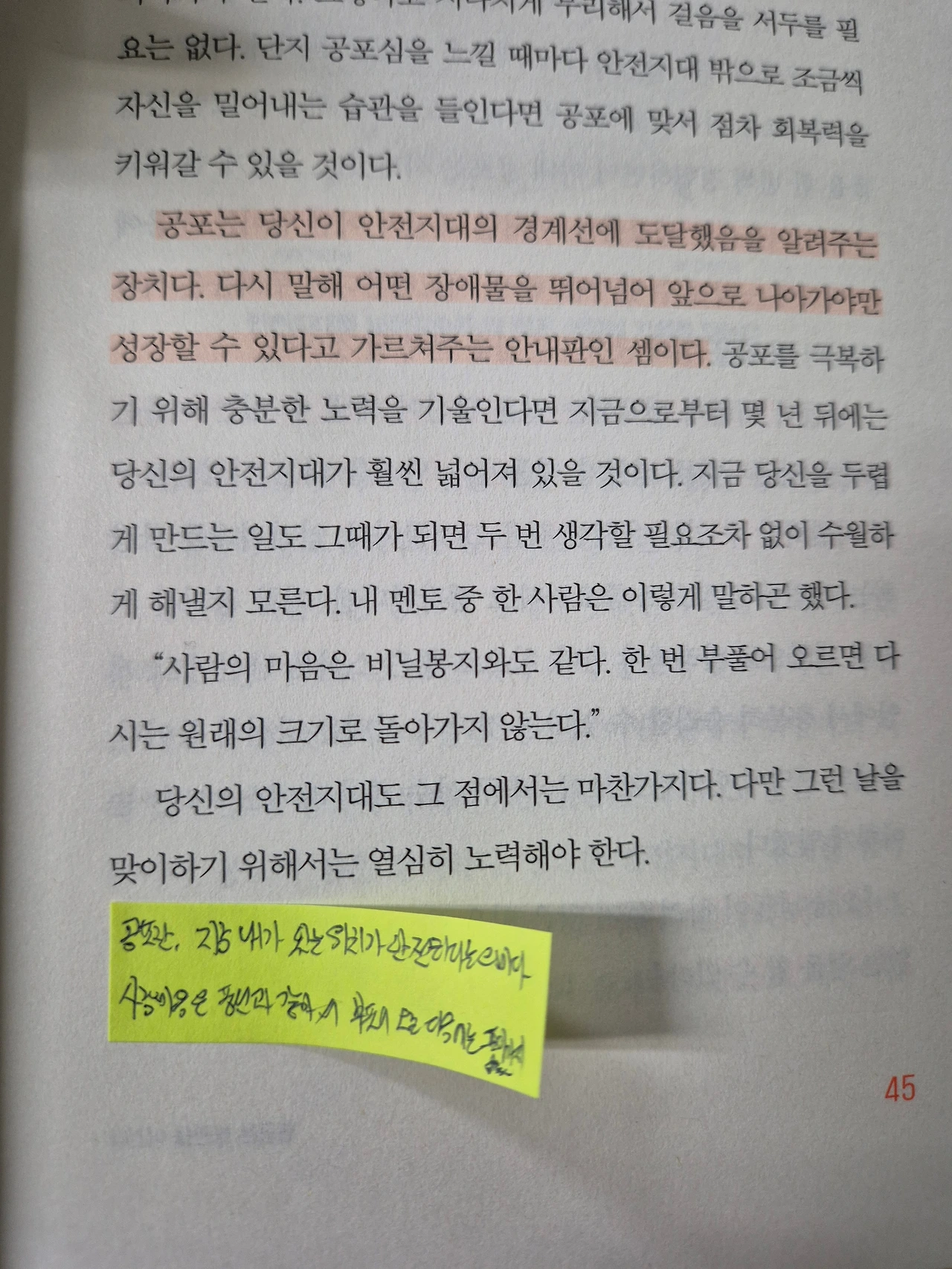 변화를 원하고 있으면서도 막상 행동으로 옮기지 못하는 이유에 대해 작가는 여러 가지를 말하지만, 저는 그중에서도 ‘공포’에 집중해 읽고 있습니다.
