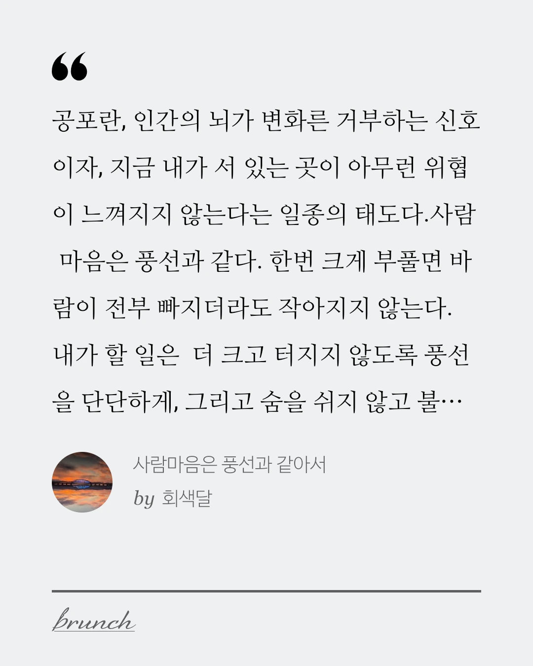 공포란, 인간의 뇌가 변화른 거부하는 신호이자, 지금 내가 서 있는 곳이 아무런 위협이 느껴지지 않는다는 일종의 태도다.