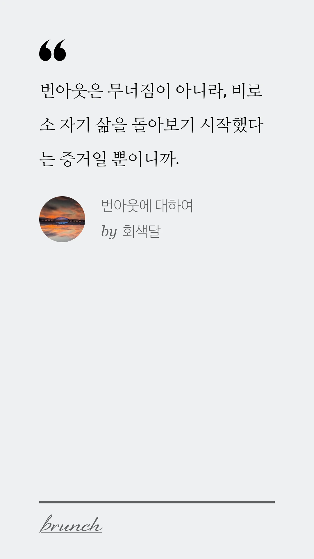 괜한 상실감이나 막연한 두려움에 나 자신을 물들이지 말자. 지금의 번아웃은 무너짐이 아니라, 비로소 자기 삶을 돌아보기 시작했다는 증거일 뿐이니까.