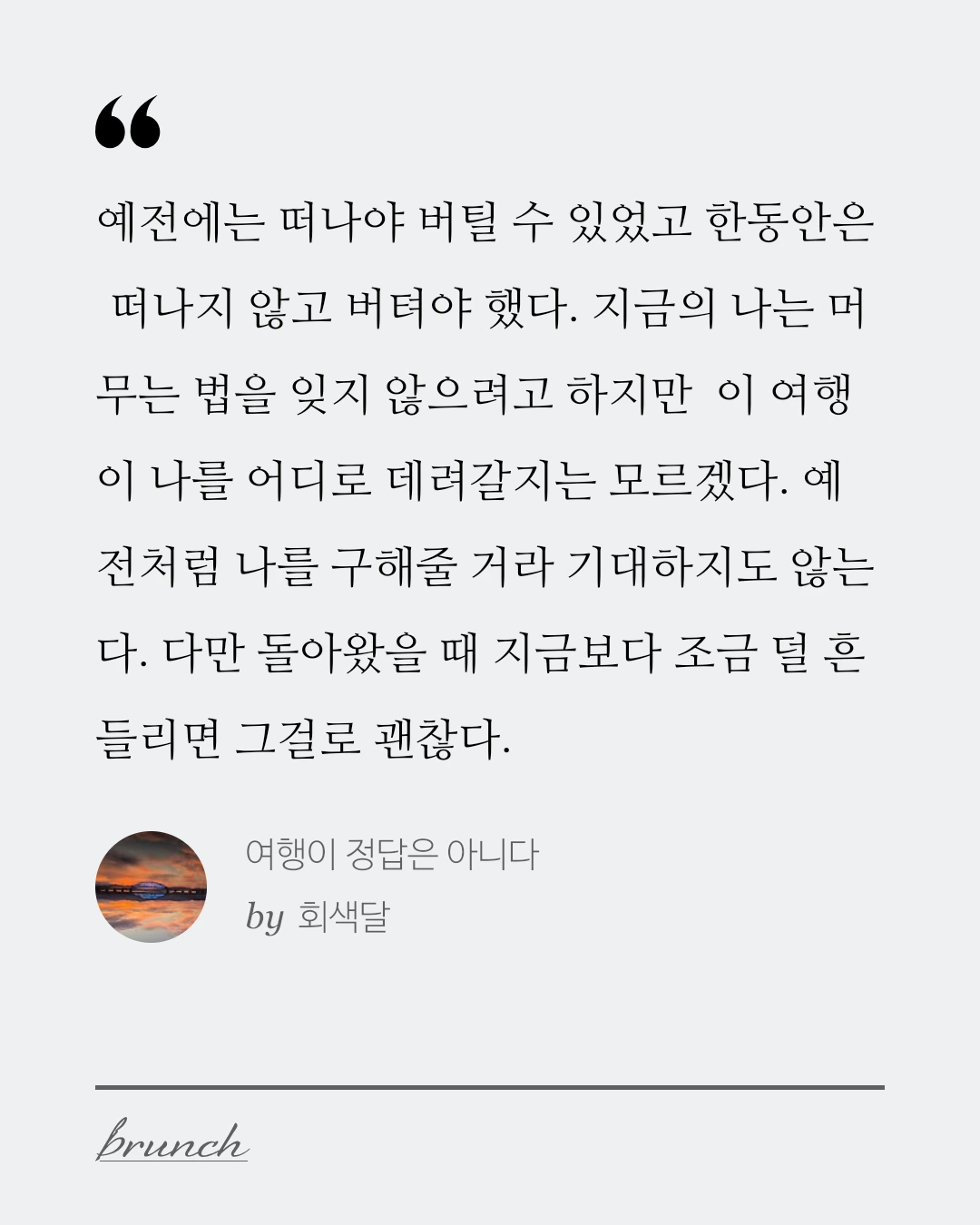 예전에는 떠나야 버틸 수 있었고 한동안은 떠나지 않고 버텨야 했다. 지금의 나는 머무는 법을 잊지 않으려고 하지만 이 여행이 나를 어디로 데려갈지는 모르겠다. 예전처럼 나를 구해줄 거라 기대하지도 않는다. 다만 돌아왔을 때 지금보다 조금 덜 흔들리면 그걸로 괜찮다. 아직은 그냥 좀 더 살아보고 싶다는 마음이 완전히 사라지지는 않았으니까.
