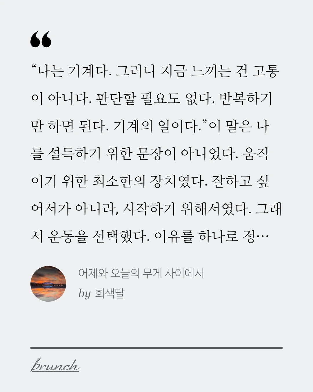 이 말은 나를 설득하기 위한 문장이 아니었다. 움직이기 위한 최소한의 장치였다. 잘하고 싶어서가 아니라, 시작하기 위해서였다. 그래서 운동을 선택했다. 이유를 하나로 정리할 수 없었기 때문이다.