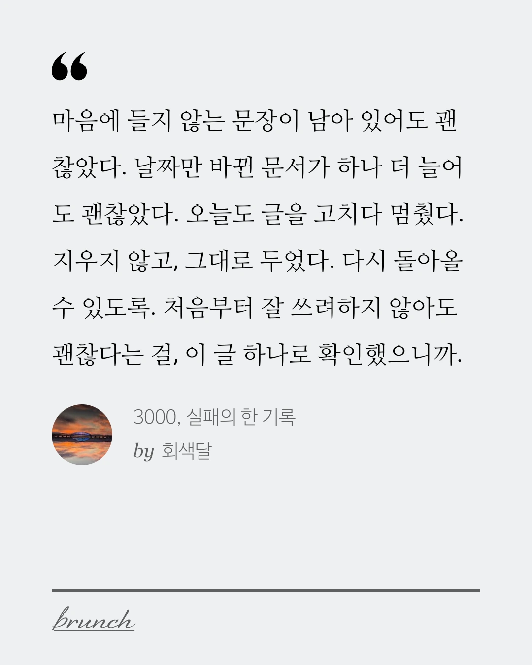 마음에 들지 않는 문장이 남아 있어도 괜찮았다. 날짜만 바뀐 문서가 하나 더 늘어도 괜찮았다. 오늘도 글을 고치다 멈췄다. 지우지 않고, 그대로 두었다. 다시 돌아올 수 있도록. 처음부터 잘 쓰려하지 않아도 괜찮다는 걸, 이 글 하나로 확인했으니까.