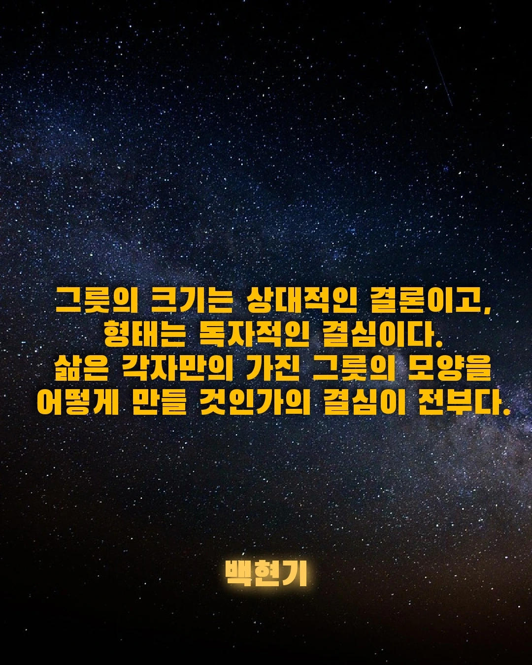 그릇의 크기는 상대적인 결론이고,형태는 독자적인 결심이다.삶은 각자만의 가진 그릇의 모양을어떻게 만들 것인가의 결심이 전부다.