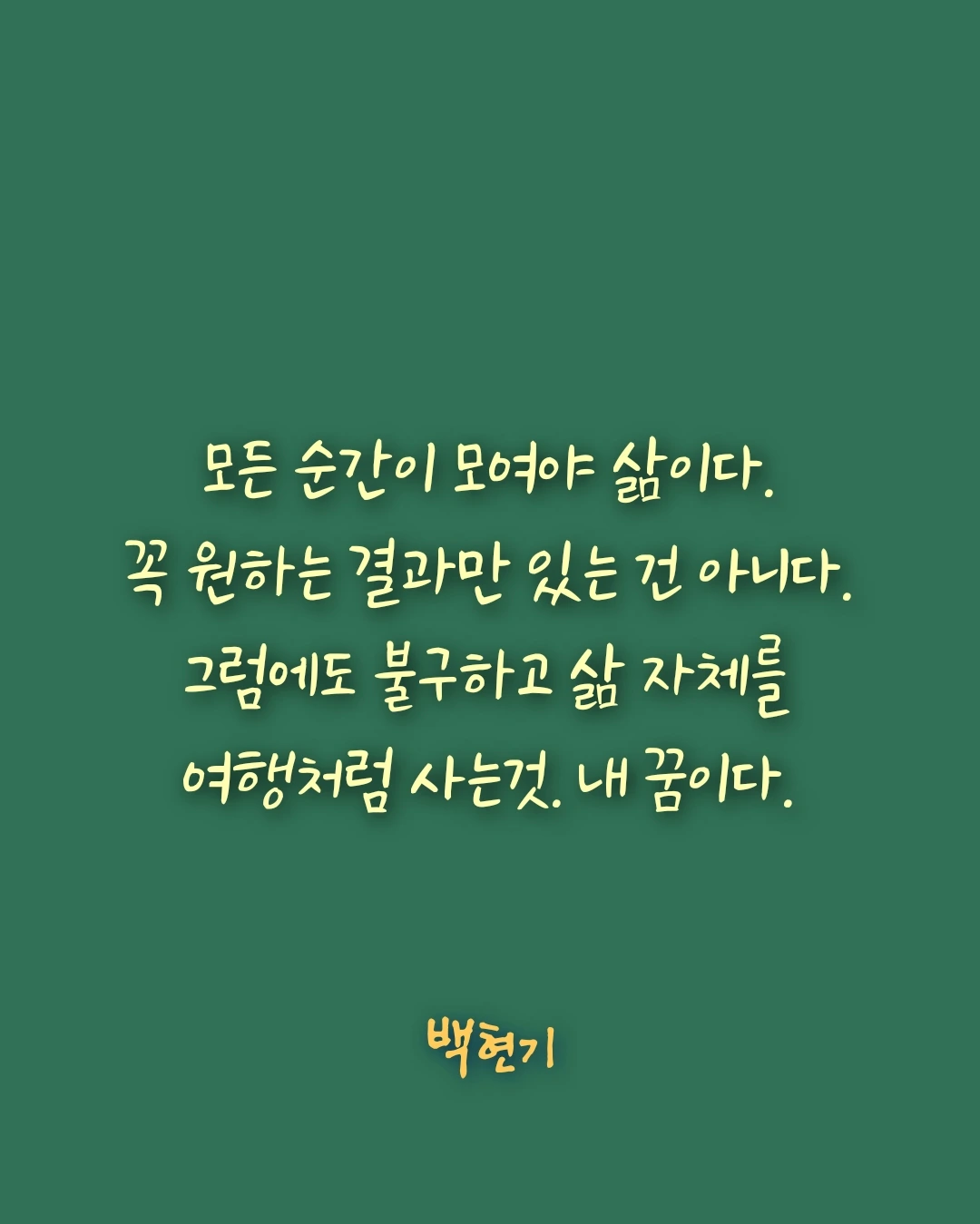 지금의 내 삶의 정답이라고 하지는 않겠다.각자가 그리는 꿈은 다른 법이니까. 다만 꿈의 희생양이 되지 않았으면 한다. '어른이 되면', '돈을 벌면'
