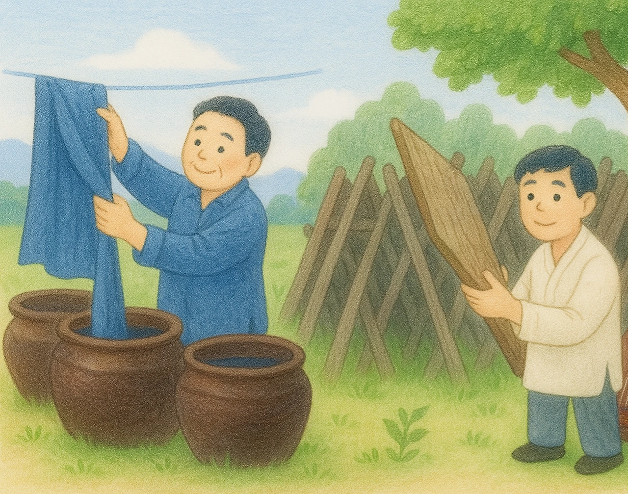 염색장은 쪽빛 천을 만들기 위해 천을 물에 담그고, 햇볕에 널고, 말리고, 다시 담그는 일을 수십 번 반복한다. 색은 그렇게 시간을 품고 만들어진다.