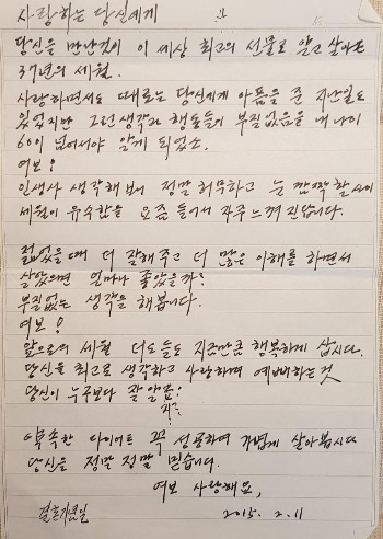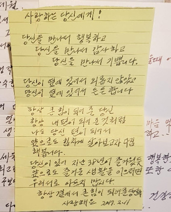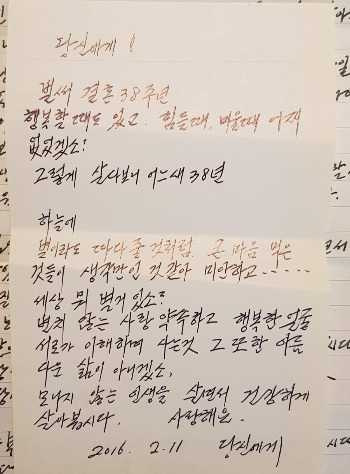 오늘은 38째 맞이하는 결혼기념일이다. 집사람에게 편지와 함께 얼마 되지 않지만 신권으로 바꿔 아내에게 전달하였다. 너무 새 돈이라 어떻게 써야 할지 고민을 하면서 받아 놓는 아내의 미소에 짠한 느낌을 받았다. 그러면서 남이섬에 일을 갔으니 외식은 물 건너갔다. _ 2016년 2월 11일 목 맑음