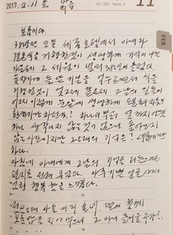 보름이다. 38년 전 오늘 세종호텔에서 아내와 결혼식을 거행한 것이 생생하게 기억이 나는 가운데 그 세월이 벌써 38년이 흘렀다. 늦장가에 들뜬 기분을 억누르면서 식을 거행한 것이 엊그제 같은데 그 날의 일들이 어찌 이렇게 눈 앞에 생생하게 펼쳐지듯이 환하기만 하던가? 하나서부터 열까지 어느 것 하나 생각나지 않는 것이 없으니 돌아오지 않는 시간이지만 그때의 기억은 새롭기만 하다. 아침에 아내에게 그 날의 기억을 더듬으면서 편지를 전해 주었다. 아주 기쁜 얼굴이어서 엄청 행복함을 느꼈다. _ 2017년 2월 11일 토 맑음