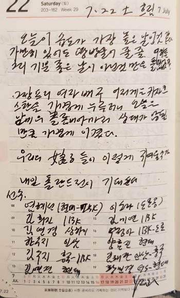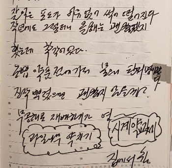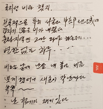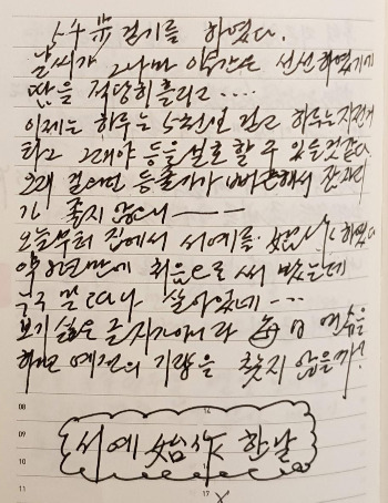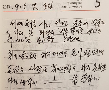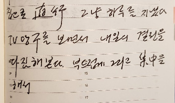 오늘부터 집에서 서예를 시작하였다. 약 8년 만에 처음으로 써 봤는데 누구 말 따라 살아있네… _ 2017년 7월 30일 일 맑고 흐림