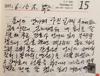 틀니가 망가져 아침 일찍 치과에 갔다. 많은 사람이 있는 가운데 내 틀니를 잘 치료해 주는 간호원 언니가 있어 부탁을 했더니 얼굴 한 번 찌그리지 않고 정성 들여 고쳐 주는 간호원 언니가 고마워 참외 1봉 다리(만원)를 선물하였다. 그 고마움에 선물을 하고 나니 마음이 한 결 가볍고 정말 잘했다 싶어 마음이 뿌듯했다. _ 2017년 6월 15일 목 맑음