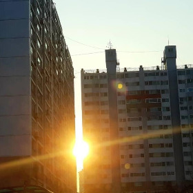 오늘은 오랜만에 아침 일찍 출근길에 올랐습니다. 집을 나서는데 갑자기 눈이 너무 부셨어요. 보니까 아파트 동과 동 사이 틈으로 해가 걸쳐 있었습니다. 마치 엄청난 보물이 천년 동안 상자에 갇혀 있다가 봉인해제되는 그 순간 같았다고 해야 할까요? 이 순간을 사진으로 남겨야 했습니다. 그리고 아내에게 메시지를 보냈습니다.