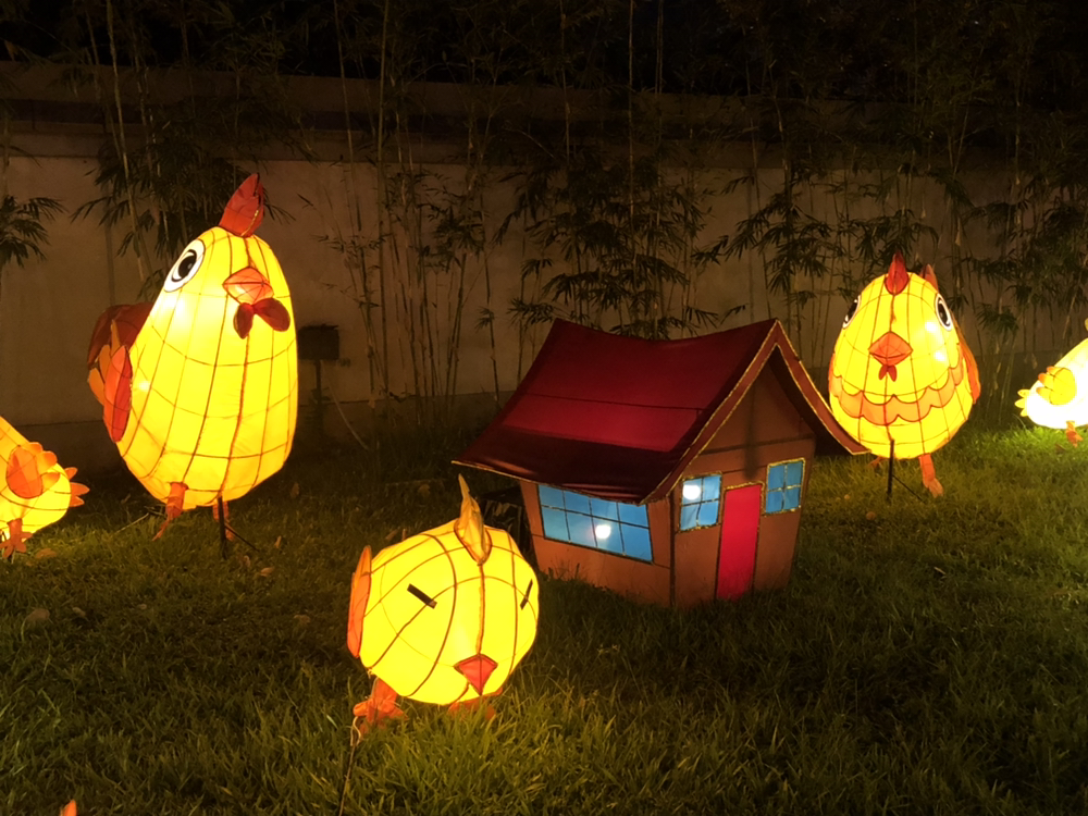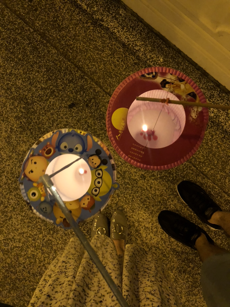 특이한 건 장식용 등롱 뿐만 아니라 휴대용 개인 등롱도 있다는 점이다. 개인 등롱을 밝혀 거리를 돌아다니는 것이 중추절 대표 놀이다. 전통적인 형태의 개인 등롱은 길거리에 걸려있는 것과 마찬가지로 원통형이 많으며 평소에는 납작하게 접어 보관하거나 휴대할 수 있다. 피면 원통 모양으로 길게 늘어나고 접으면 납작해지는 게 꼭 미술용 물통과 닮았다. 등롱 안쪽 바닥 한가운데에는 양초를 고정시킬 수 있는 고정장치가 있어, 양초를 수직으로 세울 수 있다. 양초에 불을 붙이면 어두웠던 등롱 안쪽이 밝게 빛나기 시작한다. 요즘은 양초뿐만 아니라 조그만 LED 등도 많이 사용한다고 하는데, 우리는 아무래도 전통식으로 경험해 보는 게 좋을 것 같아 양초를 설치하여 내부를 밝혔다. 등 위쪽에는 막대기가 연결되어 있어 이 막대기를 들고 다니면 된다.