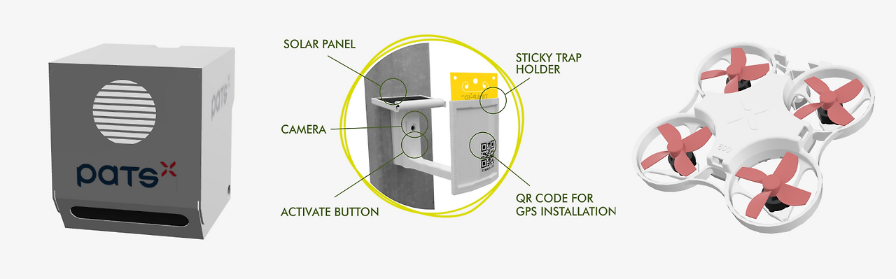 먼저, 왼쪽에 있는 PATS C는 비교적 큰 나방을 감지하고 해충인지 익충인지 판별합니다. 가운데의 트랩 아이는 작은 다양한 날벌레들을 감지합니다. 이와 같이 날벌레의 위치가 파악되면, 오른쪽의 PATS X 드론이 나방을 추적하여 프로펠러로 제거합니다.