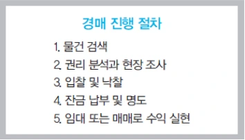 경매의 진행 절차는 다음과 같이 5단계로 구분된다. 이 절차를 잘 새겨놓고 실제로 한 번 경험해 보면 일반 매매와 비교하더라도 경매가 생각보다 어렵지 않다는 것을 알게 될 것이다.