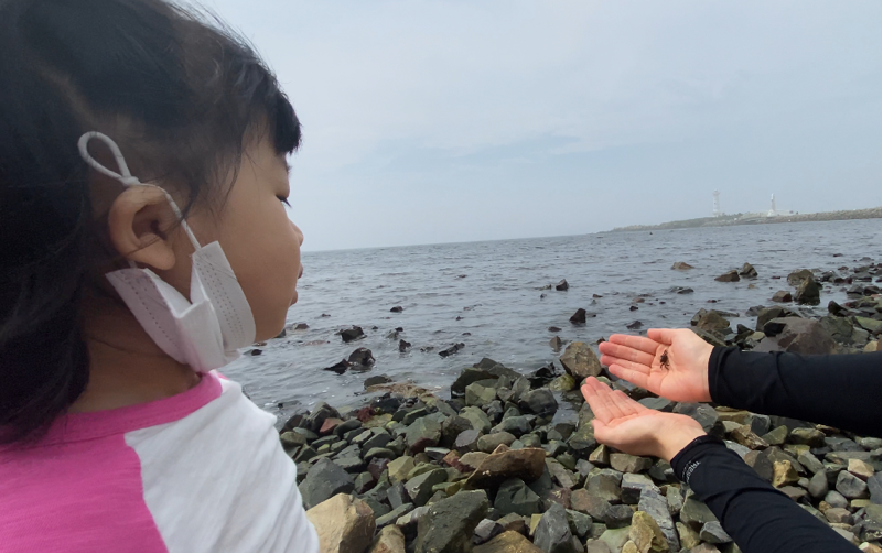 아기와 바다에 가서 꽃게를 잡아 보여주었다.