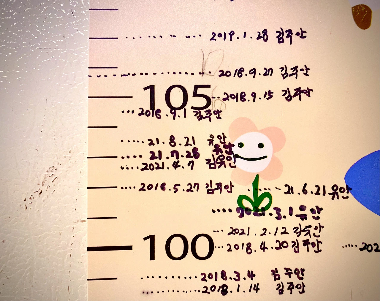 둘째 아이가 생후 46개월 되었을 때 이야기이다. 주말 아침 막 잠에서 깨어난 아이들의 키를 쟀다. 둘째 아이의 키를 재고, 눈금 옆에 아이 이름과 날짜를 적었다.