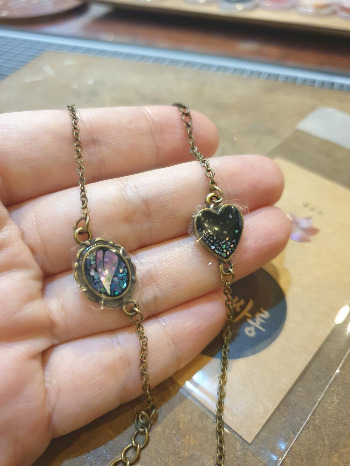 자개로 만들어진 트렌디한 작품들이 걸려있고 여기저기에 도구들이 보이는 공방 분위기가 맘에 든다. 딱 선생님과 우리 둘, 멤버도 맘에 든다. 자개에 대해 몰랐던 것도 알게 되고, 작은 자개 조각들을 붙여 만드는 자개작품들이 얼마나 공이 들어가는지도 절실히 느껴진다. 보통 이런 작업을 하게 되면 가능한 큰 거, 가능한 가득, 가능한 빽빽이 만들고 싶은 마음이 들게 마련인데, 첫째 하나는 여백의 미를 추구한다. 아이가 절제할 줄 아네 싶어 신기하다. (정작 나는 빈칸을 냅두지 못하고 채우고 채우다 결국 꽉 채우고 말았다. 하하) 둘이 도란도란 얘기하며 만드는 느낌이 좋다. 팔찌를 다 만들면 서로 선물해주기로 했다. 그저 팔찌 만드는 건데, 얘기를 하면서 만드니 더 의미가 커진다. 한 시간여의 수업 끝에 나온 작품! 만족스럽다.