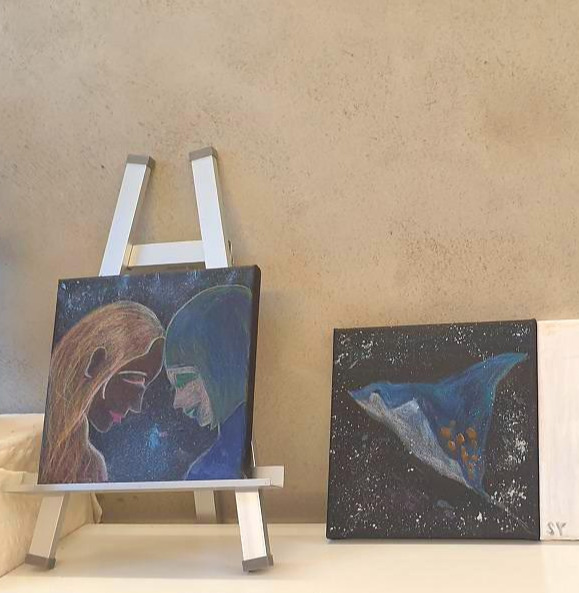 나는 쥐가오리, 큰 애는 좋아하는 웹툰의 장면을 그리기로 했다. 스케치하고 캔버스에 옮기고 칠하는 과정. 처음엔 빈 캔버스에 줄을 긋기가 부담스러웠는데 하다 보니 수월하다. 거침없이 그리고, 선생님이 손도 좀 봐주시고 하니 제법 마음에 드는 작품이 나왔다. 보통 하얀 바탕에 색을 칠하는데, 여긴 까만 캔버스에 색을 칠하는 거다 보니, 어두운 색이 아니라 밝은 색을 표현하는 게 훨씬 중요하다. 밝음이 있어야 어두운 색이 대비되어 느껴진다고 해야 하나. 생각해보면 내 뾰족뾰족한 인생그래프도, 슬럼프가 있었기에 좋은 날이 온 걸 느낄 수 있었던 거다. 빛이 있어야 어둠이 있고, 내리막이 있어야 오르막인 걸 아는 법이니까.