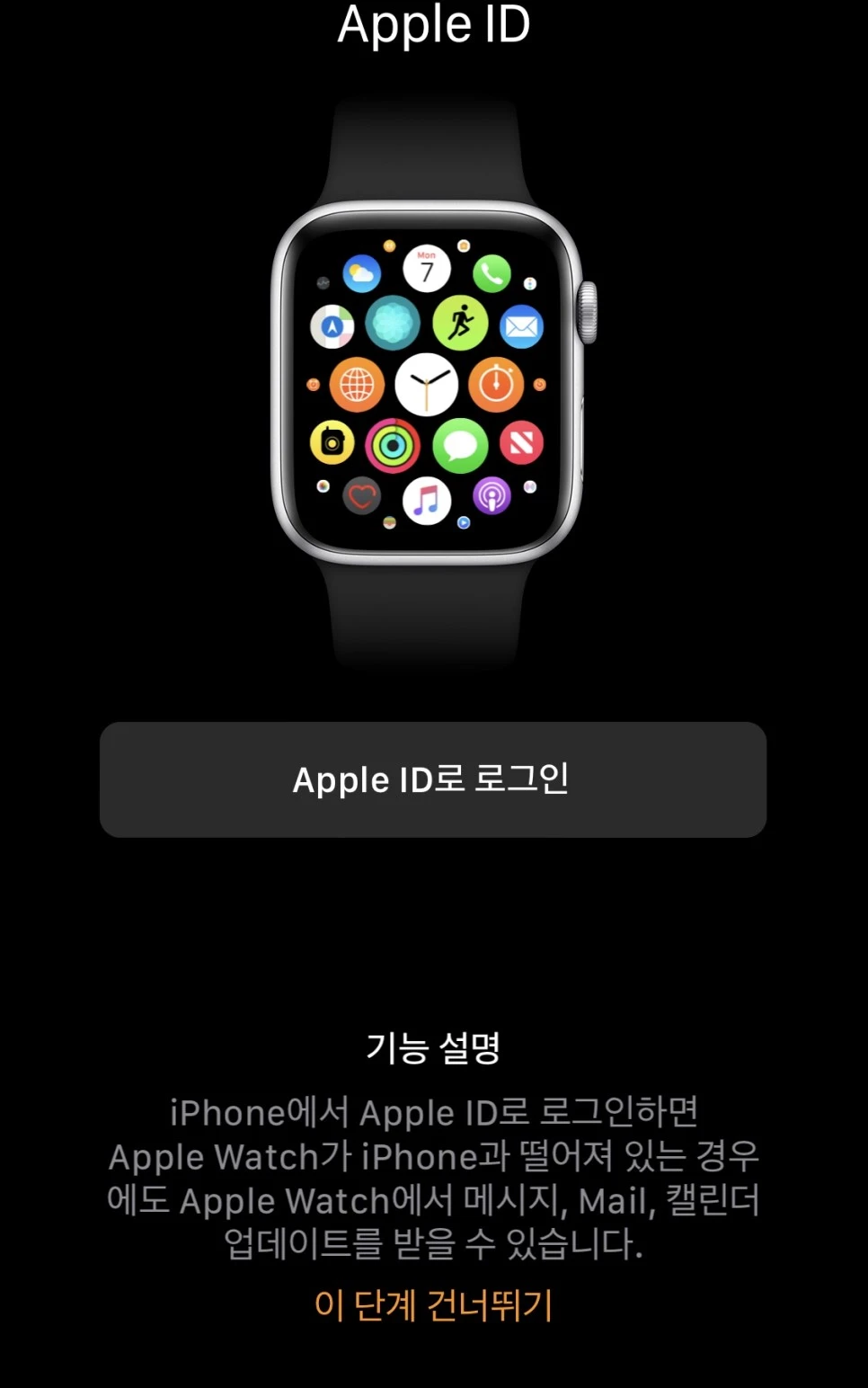 폰이 워치를 인식하고 나면 애플 아이디로 로그인 해주면 끝이다.