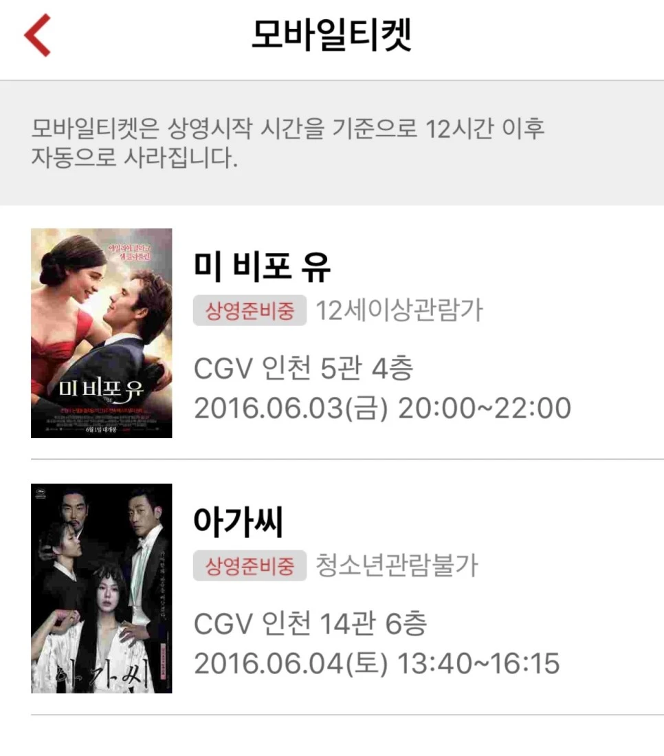 그래서 금요일 저녁에 하나(미 비포 유), 토요일 조조로 하나(아가씨) 예매를 하려다가 그냥 늦잠 좀 자고 싶어서 토요일은 점심 즈음으로 예매를 했는데,