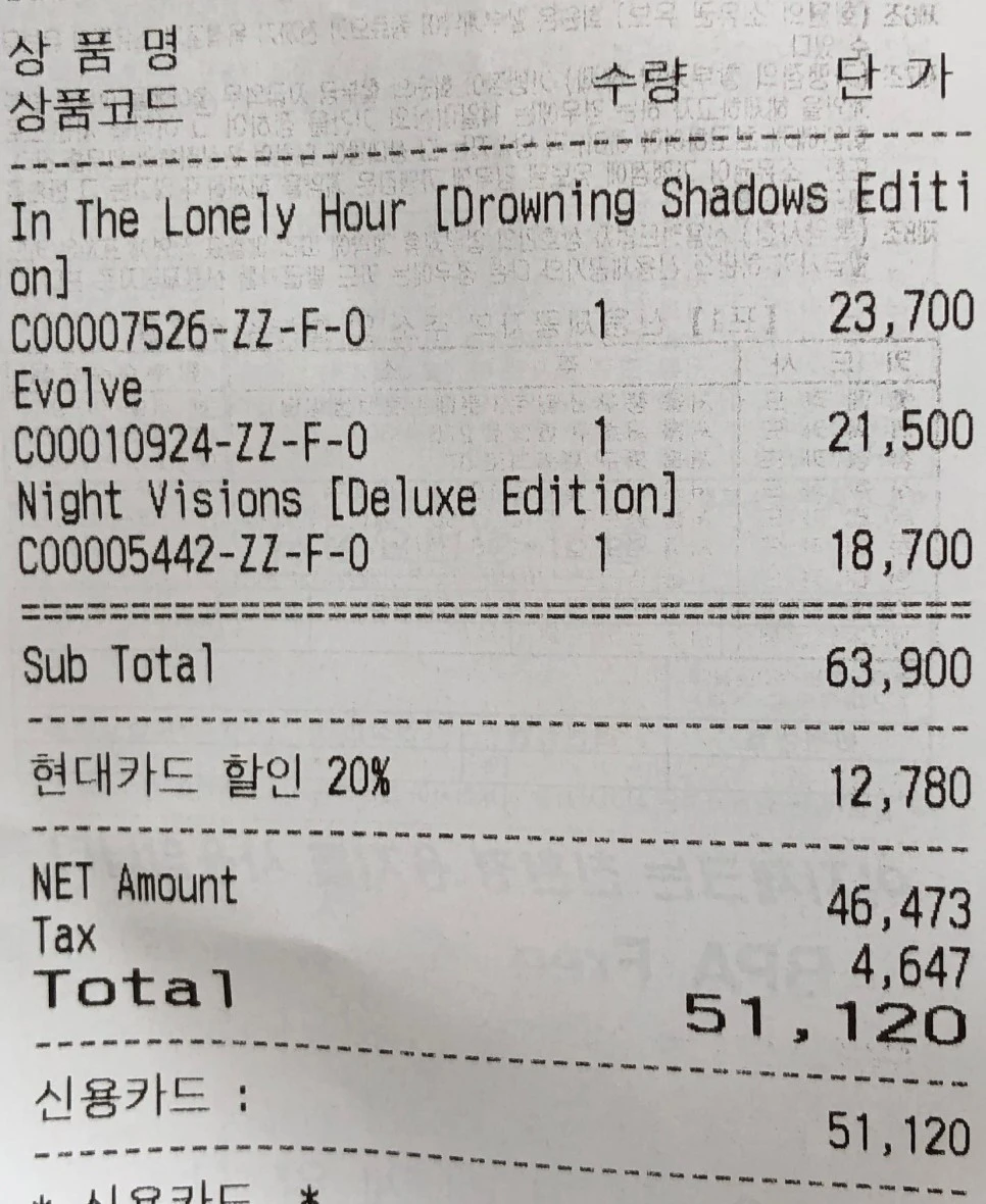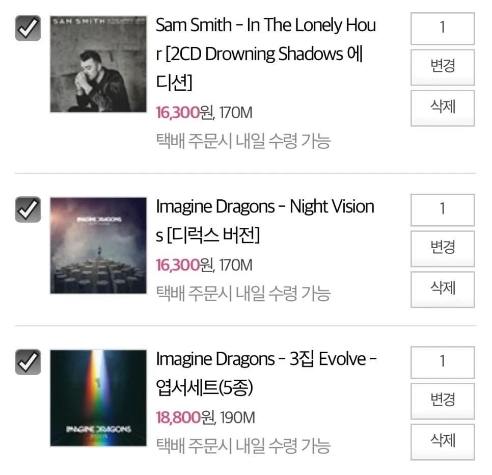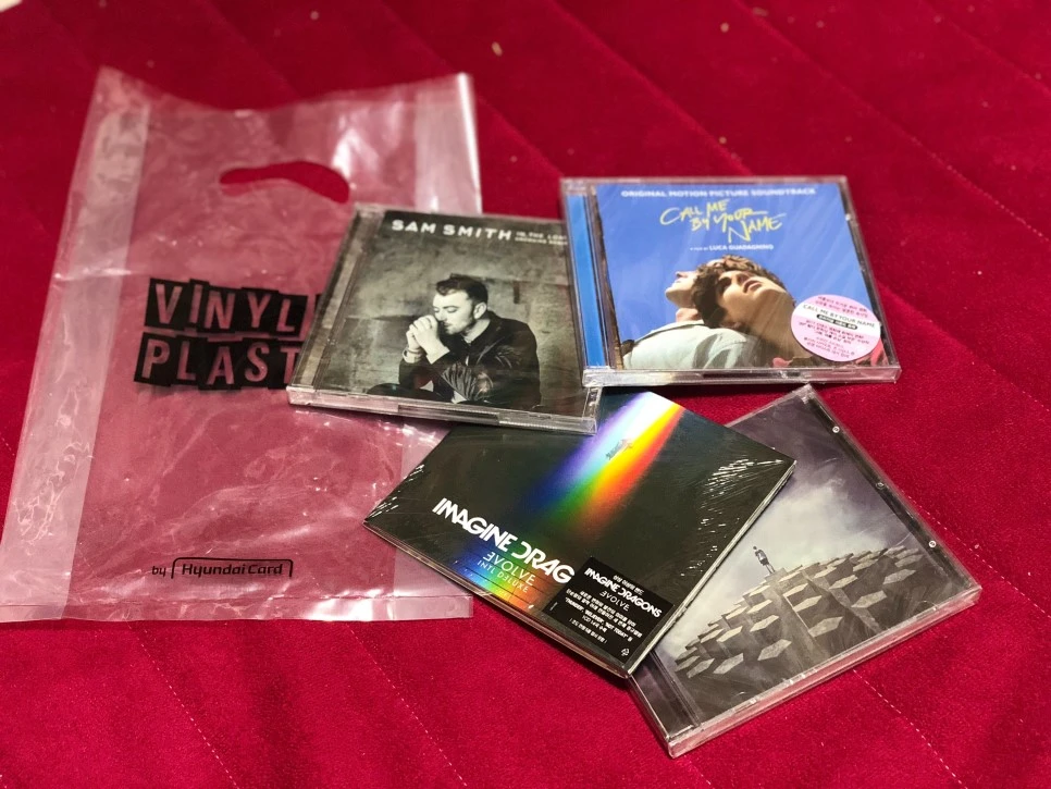 이 날의 전리품은 이매진 드래곤스의 나이트 비젼스(1집), 이볼브(3집 / 2집-스모크+미러스는스탠다드 버젼이라 알라딘에서 디럭스로 따로 구입핢), 샘 스미스 인 더 론리 아워(드라우닝 섀도우스 에디션), 그리고 선물로 받은 콜 미 바이 유어 네임의 사운드 트랙까지.