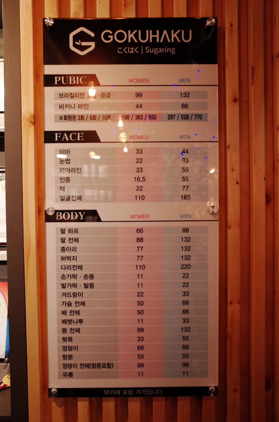 고쿠하쿠의 왁싱 가격표는 요정도.