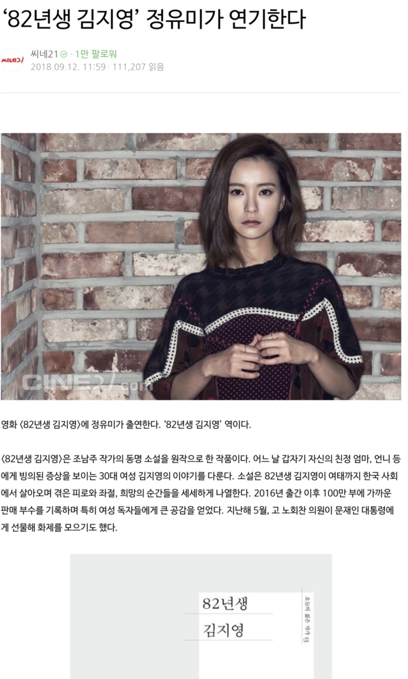 82년생 김지영을 영화화 하고 '그' 김지영 역할을 정유미가 맡는다고 했을 때, 뭇 남성들의 윰블리 탈덕 선언과 함께 온갖 악플을 그녀의 인스타그램에 다는 걸 실시간으로 봤다. 한국의 페미니즘이 기괴하게 정착되고 있다는 걸 모두가 알텐데 굳이 작품을 선택한 배우한테 해코지를 할 필요가 있을까? 다들 합의금 많아? 왜 그러려니가 되지 못할까 우리는. 이래서 우리가 욕을 먹는거야.