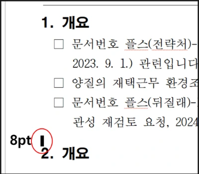 6) 예시로 작성된 문서는 1. 개요, 2. 배경 및 사전검토, 3. 활용 및 관리방안, 4. 기타 로 구성되어 있어요. 줄간격이 160%로 설정되어 있는데, 대분류의 폰트크기가 크기 때문에, 대분류가 바뀔 때 직전 마지막 줄과 새로운 대분류 간의 간격이 너무 넓어도 보기가 좋지가 않아요. 그럴 때는, Space를 하나 넣고, 그 Space의 크기를 8pt로 맞추면 사이즈가 아래와 같이 딱 적당해집니다.