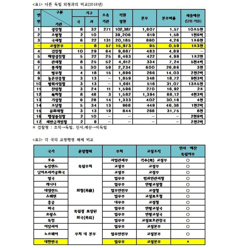 정부 전체 17개 청 단위 조직과 비교 및 외국의 교정행정제도와 비교를 해보면 이런 독립 외청 주장이 결코 무리한 것이 아니라는 것을 확인할 수 있고, 혹여 일반인이 보기에는 염불보다는 잿밥에 관심 있는 부처 이기주의 수준이 아니냐는 의심도 어느 정도 해소할 수도 있을 것 같습니다.