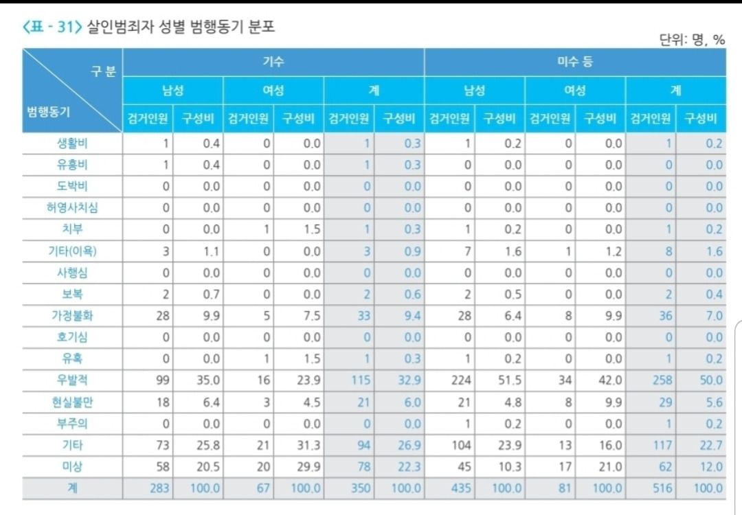 2018년도 경찰청에서 발표한 범죄통계지표를 보더라도 살인범죄자 중에서 남녀 불문하고 범행 동기가 우발적인 경우가 가장 높게 나타나는 경우를 볼 수 있습니다.