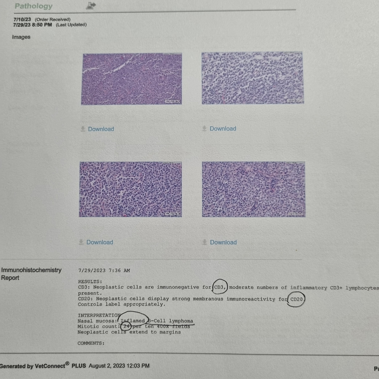 그리고 2주 전에 맡긴 세포 검사 결과가 나왔다. 이아의 림프종이 어떤 종류인지를 구분해 향후 치료 방향을 정하기 위한 것이다. 고양이 림프종은 크게 T-cell 림프종과 B-cell 림프종으로 나뉘는데, 보통 B-cell 림프종이 많고 또 그나마 예후가 좋은 것으로 평가된다...라지만 솔직히 크게 차이도 없다고 한다. 그냥 어떤 병인지 정확히 알자는 취지 정도로 이해하면 좋을 것 같다.