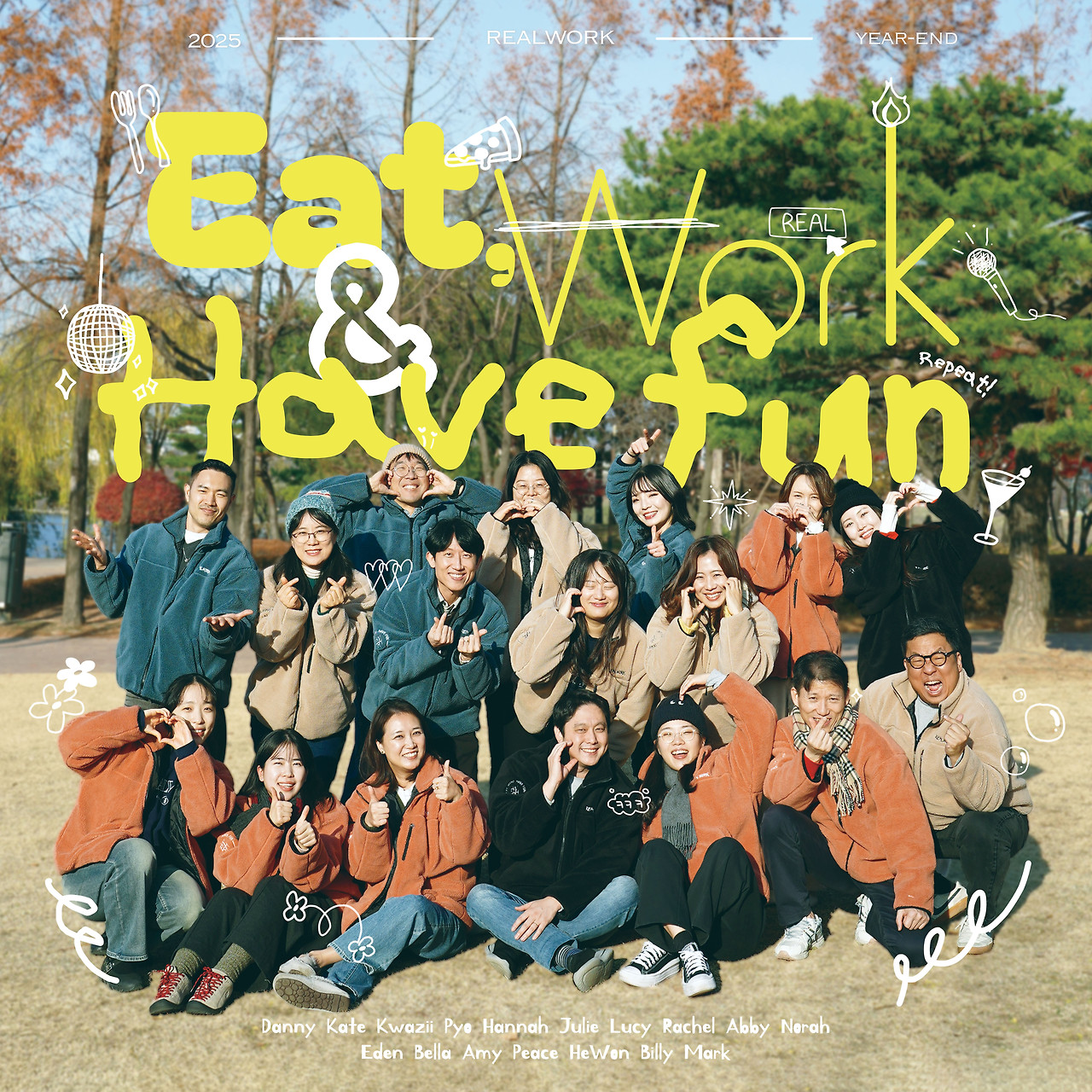 이번 뮤직비디오 제목 "Eat, Work and Have Fun"은 리얼워크가 지향하는 조직문화의 방향이자 제가 추구하는 삶의 모습이기도 합니다.