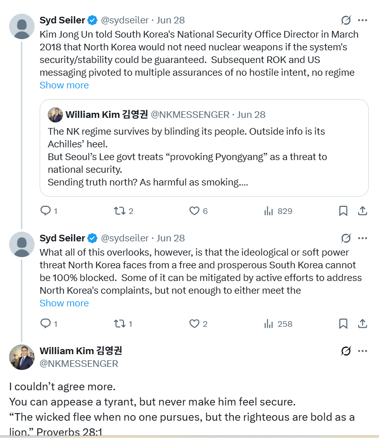 최근 저는 인터넷 사회관계망 서비스인 X를 통해 워싱턴의 대표적인 북한 전문가이자 6자회담 특사였던 시드니 사일러 전 국가정보국(DNI) 국가정보위원회(NIC) 북한담당관과 의견을 나눴습니다.