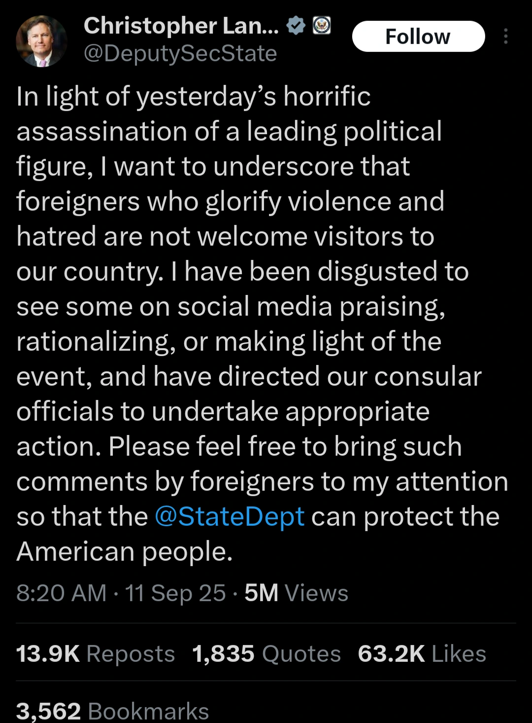 루비오 국무장관이 지난 5월, 미국 비자는 “권리가 아닌 (혜택을 준) 특권”이라며 우리 법을 위반한 자는 적발 즉시 비자 지위를 취소할 것이라고 경고한 것도 같은 맥락입니다. 나아가 크리스토퍼 랜다우 부장관은 커크 암살을 미화하는 외국인은 사실상 미국 입국을 불허하겠다는 입장을 밝혔죠. 국방부(전쟁부)는 커크 암살을 축하하거나 조롱한 직원들을 색출해 징계하는 작업을 지속하고 있죠.