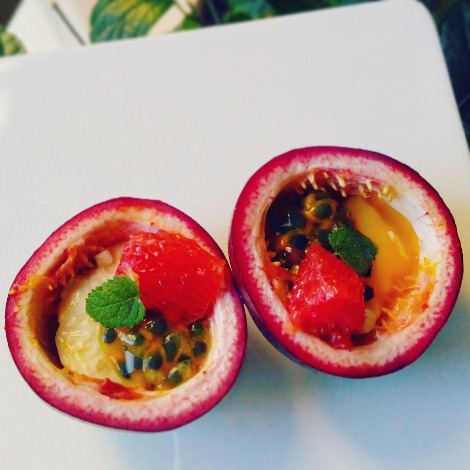 과육을 파낸 패션후르츠 껍질에 연두부와 자몽 조각을 담는다.