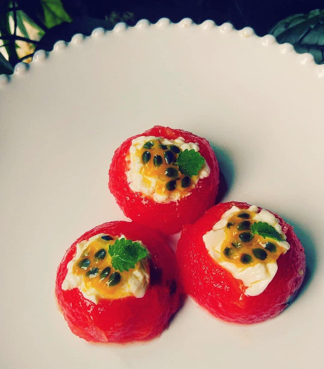 티 스푼으로 수박 속을 연두부로 채우고, 패션후르츠와 레몬밤으로 장식하면 끝!