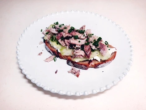 ⑤ 구운 고등어의 살을 발라서 올리고 후추와 레몬즙을 뿌린다.