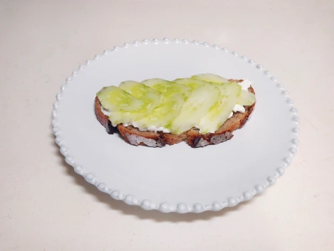 ④ 껍질을 벗겨서 슬라이스 한 오이를 올린다.