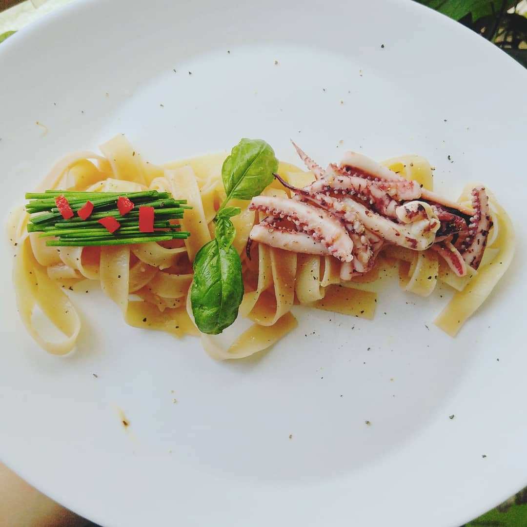 ① 손질된 오징어를 먹기 좋은 크기로 썰고, 소금을 넣은 끓는 물에 파스타면을 넣고 삶는다.