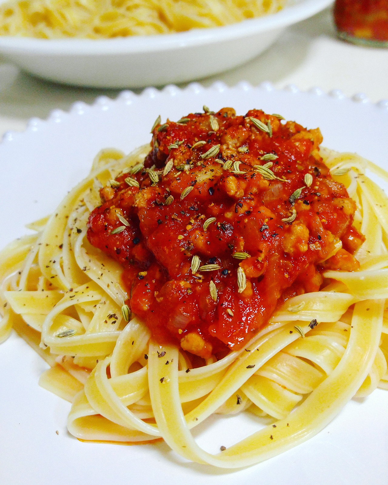 ⑥ 삶은 면을 건져서 접시에 담고 토마토 소스를 얹고 후추와 펜넬씨를 뿌려 마무리~