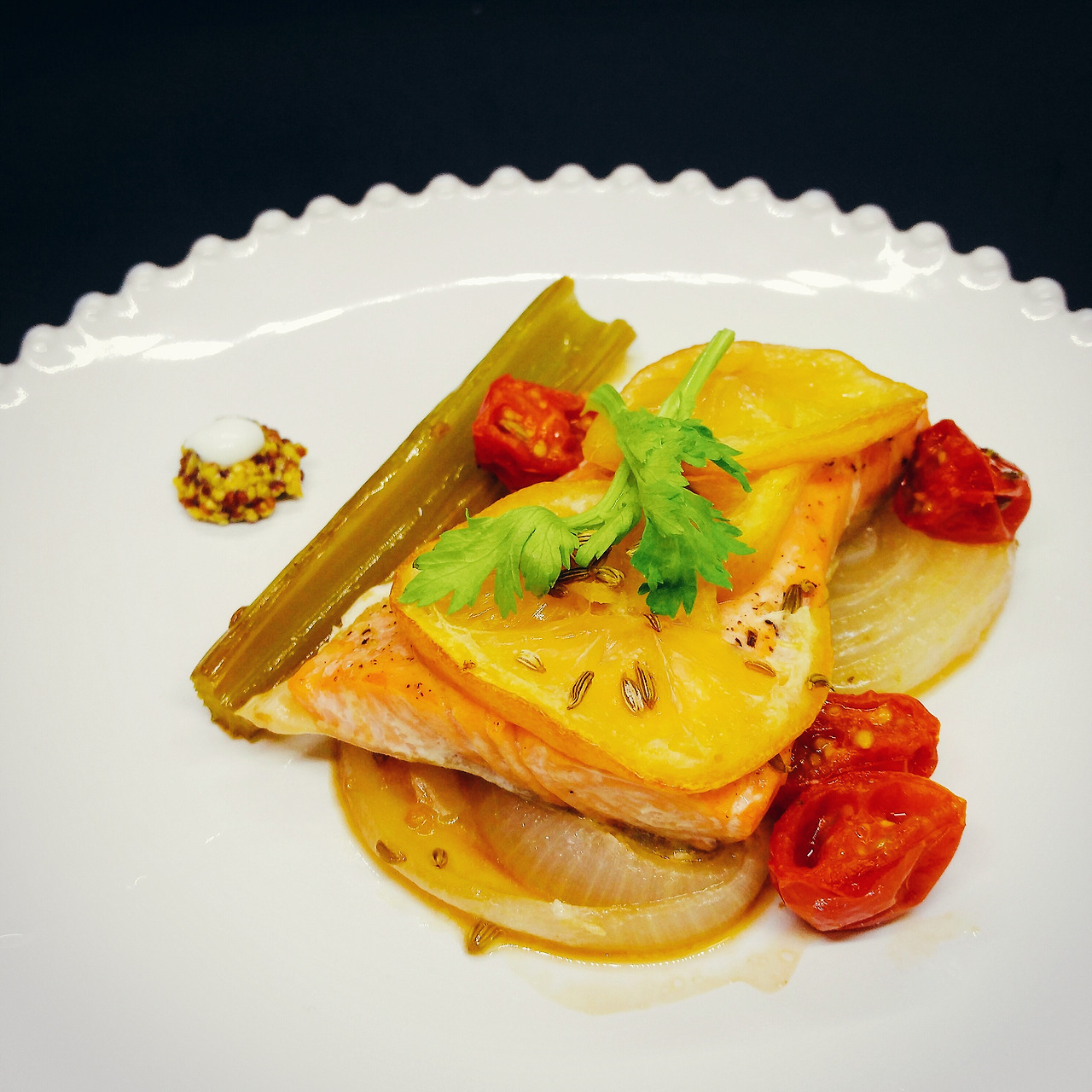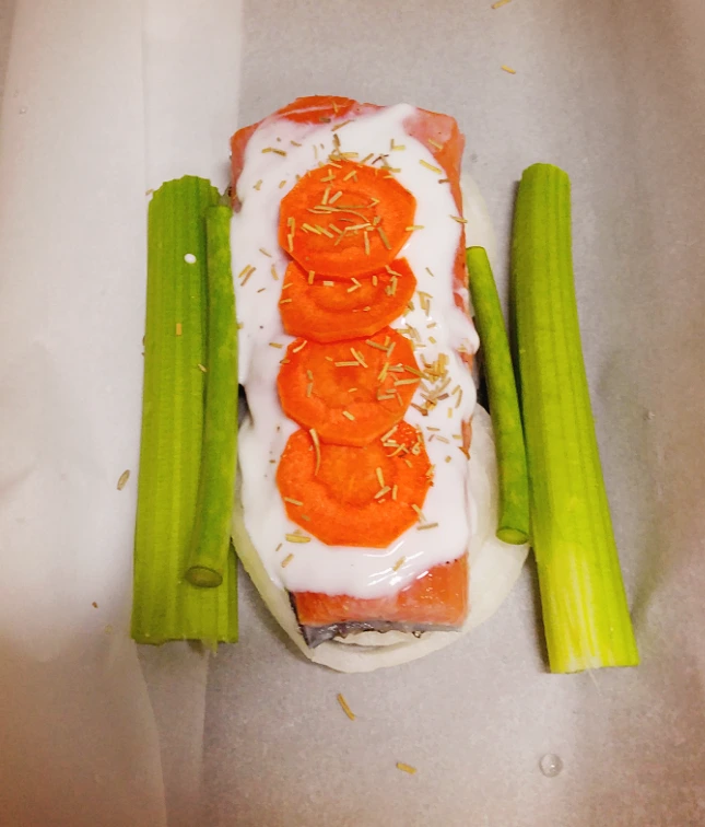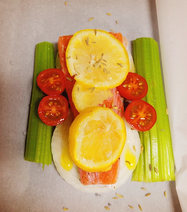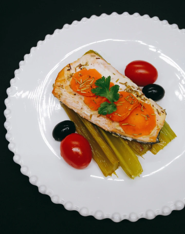 부드러운 연어와 구운 야채의 촉촉한 맛이