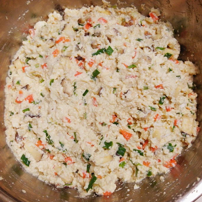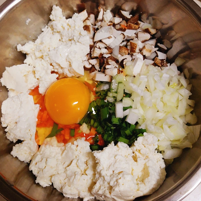 • 속재료에 물기가 많으면 썰기도 힘들고 식감도 별로다. 두부의 물기를 꽉 짜고 전분으로 조절하자.