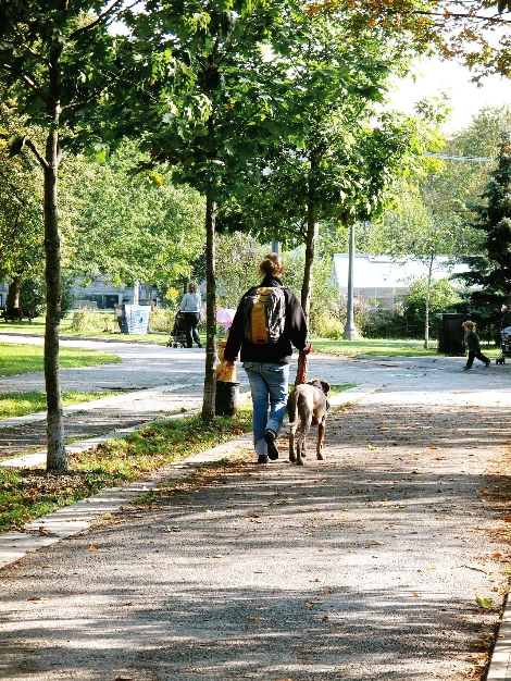 수풀이 우거진 산책로와 넓은 잔디밭.